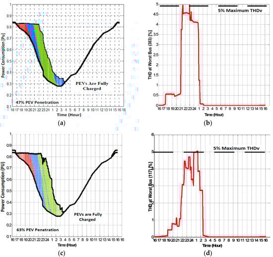 Figure 7. Simulation results for Case 3: Installation of PPF with NOL-MSSCA considering harmonics including power consumption and THDv; (a,b) 47% PEV penetration; (c,d) 63% PEV penetration.
