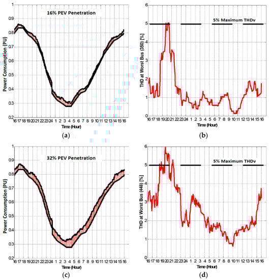 Simulation results for Case 2: NOL-MSSCA considering harmonics including power consumption and THDv of (a,b) 16% PEV charging penetration; (c,d) 32% PEV charging penetration; (e,f) 47% PEV charging penetration.
