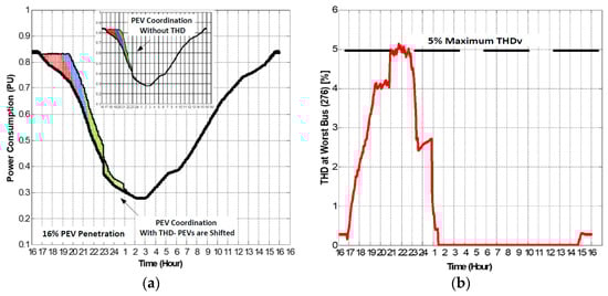 - Uncoordinated charging of PEV batteries (case 1) could have negative impacts on the performance and power quality of a smart grid. It could result in unacceptable THDv levels beyond the permissible limits of the IEEE-519 Standard, particularly at high penetrations of EVs during peak-load hours. Table 2 and Figure 5 indicate that the system’s THDv level is above 11% for a high PEV penetration of 47%.