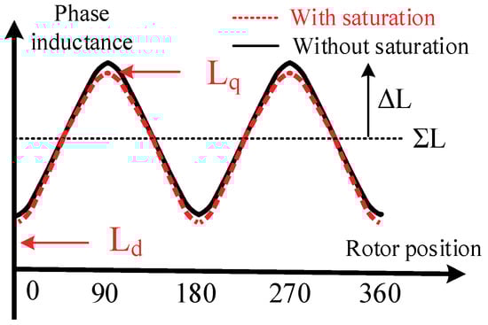 In (4), only a single saliency harmonic with respect to 2θe is considered [10]. It is assumed that the phase inductance waveform in Figure 1 is purely sinusoidal where the frequency is 2 times with respect to the rotor position. However, for actual machines, flux saturation must occur due to the nonlinear relationship between flux density and magnetic field strength. Considering the flux saturation, the phase inductance waveform might be changed by the red signal in Figure 1. Under this effect, secondary saliency harmonics instead of a 2θe harmonic occur, leading to saliency-based position estimation error. In this paper, the ideal saliency signal in (4) is extended to consider saturation saliency harmonics as depicted in (5).