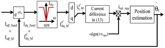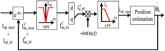 Assuming the estimated frame in Figure 2 is not aligned with the actual frame at the initial estimation state, a saliency current in (3) appears where the magnitude is dependent on ΔL. The rotor position can be obtained by regulating θerr to be zero in . However, is modulated by cos(ωct) due to the HF sine-wave injection. In [19,20], a signal process by multiplying the same per unit sine voltage and adding a low-pass filter (LPF) is proposed to obtain the spatial saliency signal, isal_sine. Figure 3 illustrates the signal process of saliency-based position estimation using a sine-wave voltage injection. In addition to the LPF, a high-pass filter (HPF) is applied to isolate the injection-induced current from the fundamental current. The corresponding analytical equation of isal_sine is given by