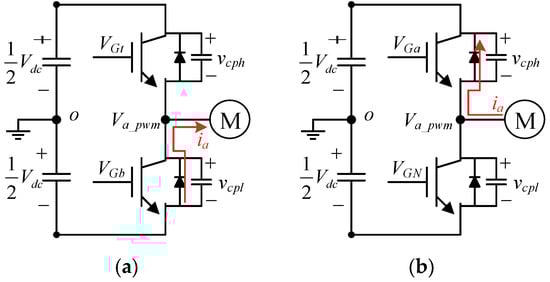 Illustration of A-phase current in the inverter leg during dead-time when the current polarity is (a) positive and (b) negative.