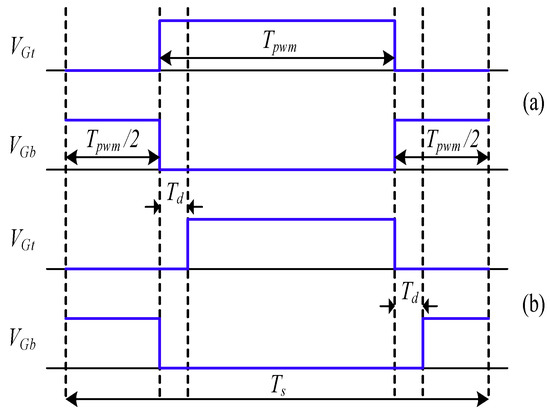 Voltage gate signals VGt and VGb in an inverter (a) with and (b) without the dead-time.