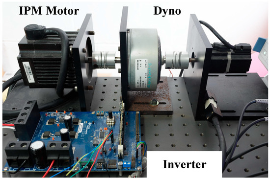 An IPM machine with a 1.41 saliency ratio (Lq/Ld) is built to verify the saliency-based position estimation analyzed in Section 2 and Section 3. Table 1 lists the specifications of this test machine. A two-level inverter with 150-V DC bus voltage is used to generate PWM voltages. The PWM frequency is designed at 10-kHz to balance the dynamic response and switching losses. Figure 7 illustrates the test setup of the saliency-based drive for the test machine. A hysteresis brake is back-to-back connected to the test machine for operation under load. All the control and position-sensing algorithms are implemented in a fixed-point 32-bit microcontroller TI-TMS320F28069. For the following experiments, the magnitudes and frequencies of the two injection voltages are the same at 30 V and 1 kHz to easily evaluate the performance difference.