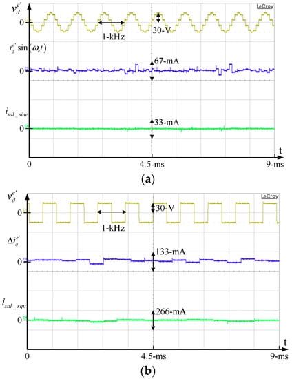 Comparison of saliency signals by injecting (a) the sine-wave voltage signal and (b) the square-wave voltage signal (VC = Vsqu= 30 V, fC = fsqu = 1 kHz and the machine is locked at standstill).