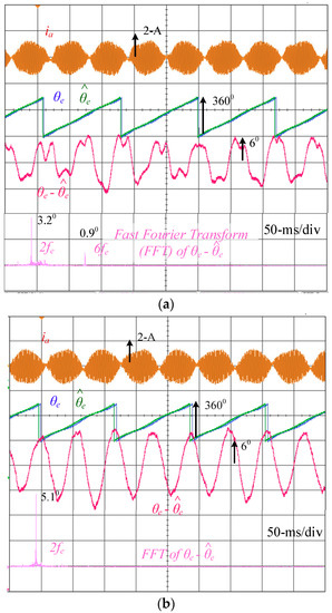 Saliency-based position estimation at full load using (a) sine-wave and (b) square-wave voltage injection (VC = Vsqu = 30 V, fC = fsqu = 1 kHz and 100 rpm speed control where ωe = 2π × 5 rad/s).