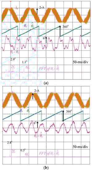 Saliency-based position estimation at no load using (a) sine-wave and (b) square-wave voltage injection (VC = Vsqu = 30 V, fC = fsqu = 1 kHz and 100 rpm speed control where ωe = 2π × 5 rad/s).