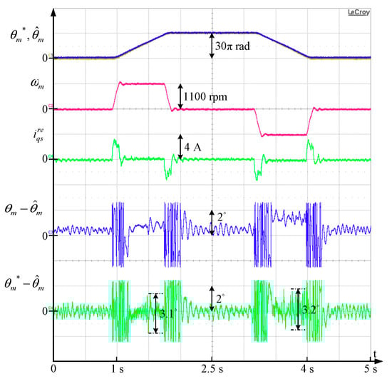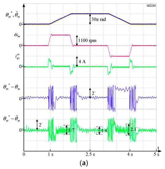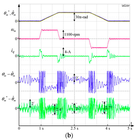 Position control based on saliency-based position estimation using different injection signals is compared in Figure 11. As seen in (a), the saliency-based drive with sine-wave voltage injection is applied. The machine’s position is manipulated from the mechanical position = 0 rad to 30π rad. During the speed transition, the peak-to-peak mechanical position estimation error θm– is around 4.2 degrees. However, this error can be negligible once the drive arrives at steady state. By contrast, the position control error – is around 1.4 degrees at steady state. Figure 11b compares the similar position control with the saliency-based drive while the square-wave voltage is used. At steady state, the estimation error θm– increases to 2 degrees. The control error – also increases to 2.3 degrees, resulting in degraded position control accuracy. Similar to prior experimental results, the influence of dead-time on the square-wave voltage signal is the primary issue to cause this higher estimation error.
