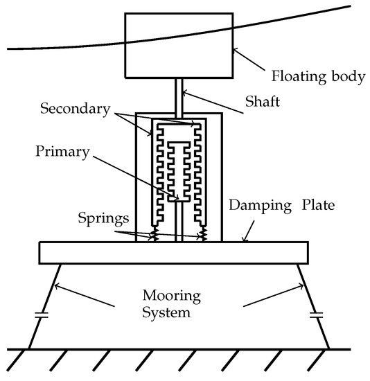 The point absorber device illustrated in Figure 2 is considered in the present work to evaluate the performance of the TLSRG as PTO. The conversion system is characterized by a floating buoy of cylindrical shape and a floating submerged reference system where the TLSRG is held. The reference system is assumed to be fixed to bottom by means of mooring cables. Thus, only heave motion is allowed for the floating buoy and for the movable part of the TLSRG, which are assumed to be rigidly connected. A mechanical spring is considered to connect the oscillating body to the reference system in order to assist the body motion, if necessary.