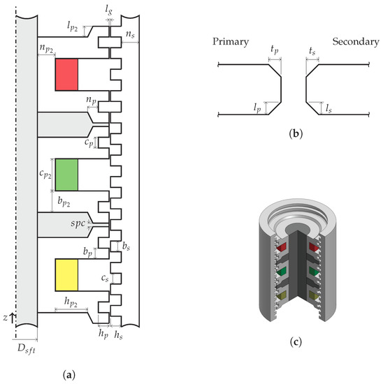 Tubular linear switched reluctance generator (TLSRG) used as PTO: (a) longitudinal cross-sectional profile; (b) tooth shape; and (c) 3D illustration.