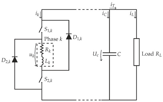where and are, respectively, the voltage drops of each electronic switch and free-wheeling diode.