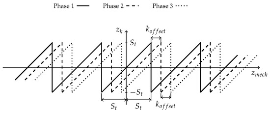 where is the displacement described by the movable part between the alignment and the non-alignment positions and represents the distance between the same electric position of two consecutive phases. Equation (18) is represented in Figure 6.