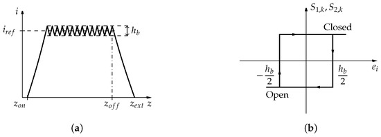 In the hysteresis control, the error , given by the difference between the phase current i and the respective reference value , is maintained within a range of values defined by the hysteresis band . When the error is higher than , the electronic switches are closed to apply the converter bus voltage to the phase terminals to increase its current value. When is lower than , the electronic switches are opened and the phase is subjected to a negative voltage forcing the respective current to decrease [35]. Thus, with the hysteresis control, the generator conversion cycle is defined by successive excitation and generation periods. Figure 7a shows the typical current profile obtained by the hysteresis control. Figure 7b shows the respective control logic diagram. In each electric phase, the generation cycle is initiated at the electric position , when the electric switches are closed to energize the coils, and it finishes at the position , where the electric current starts to decrease until is extinguished at the position .