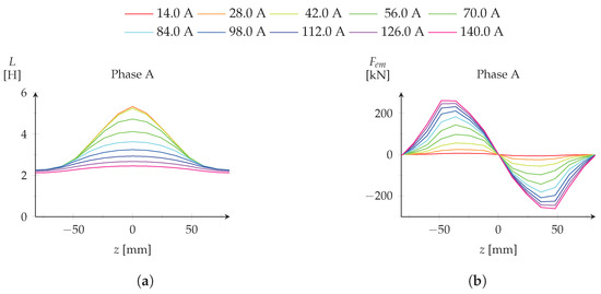 Electromagnetic characteristics for the electric phase A of the TLSRG: (a) inductance; and (b) axial force.