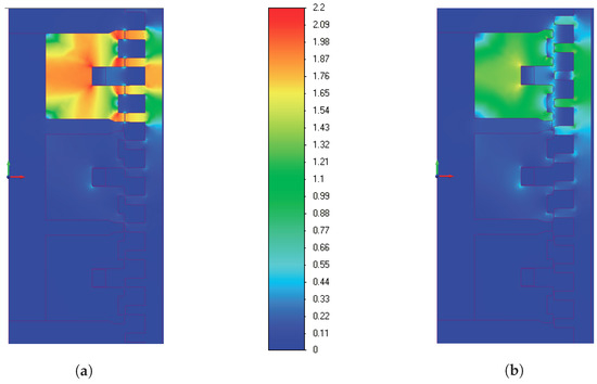 Distribution of magnetic flux density (in Tesla) for electric phase A with a current intensity of 100 A at: (a) alignment position; and (b) non-alignment position.