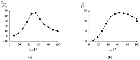 The performance of the conversion system was evaluated assuming a constant value for and applying the proposed MPPT strategy. For the first case, the behavior of the system has been evaluated for 10 different values of . The mean value of the generated electrical power and the electric conversion efficiency , for each value of , are displayed in Figure 12. For the second case, the system was subjected to an optimization process to search the optimal values of and for maximum electric power generation. The optimal value search was conducted by the Box Complex method, within the boundaries defined by 5 × 10−3 s and 1 s for , and defined by 1 × 10−1 A and 7 A for . As a result, the optimal values of 6.8 × 10−2 s and 6.8 A were computed for and , respectively.