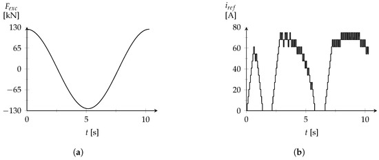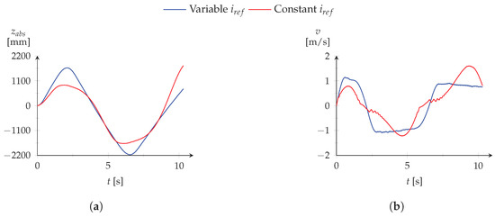 The excitation force profile adopted for each simulation can be observed in Figure 13a. The profile provided by the MPPT controller is exposed in Figure 13b. The oscillating body absolute position and velocity are presented, respectively, in Figure 14a,b for the operation with constant and variable . The corresponding phase current intensity and electromechanical force are displayed, respectively, in Figure 15 and Figure 16. The DC bus voltage level is represented in Figure 17.