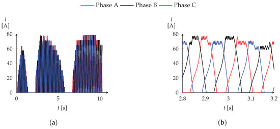 Electric current profile for each electric phase: (a) normal view; and (b) zoomed view.
