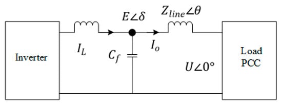 As shown in Figure 1, the inverter is regarded as a controllable voltage source . As sensors existing in this system, the voltage of the load point of common coupling (PCC) is denoted as , and the impedance of the line is . The droop control expressions are presented as follows: