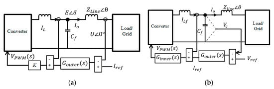 As shown in Figure 2a, the control loop of CCM is quite simple. However, its performance relies largely on the state of the grid. When the inverter is connected to the weak grid, such as the microgrid in CCM, the disturbance from the grid affects the inverter’s performance considerably. Spikes may appear when the grid voltage changes. Because stability has to be taken into consideration, inverters connecting to the microgrid are expected to be able to maintain the voltage of the microgrid [26]. In addition, as a basic demand of the distributed generation system, the inverter must be able to operate in both islanded and grid-connected mode. Thus, the VCM, which is shown in Figure 2b, is a more appropriate control strategy to be investigated. To introduce the detailed analysis, the system block is presented in Figure 3.