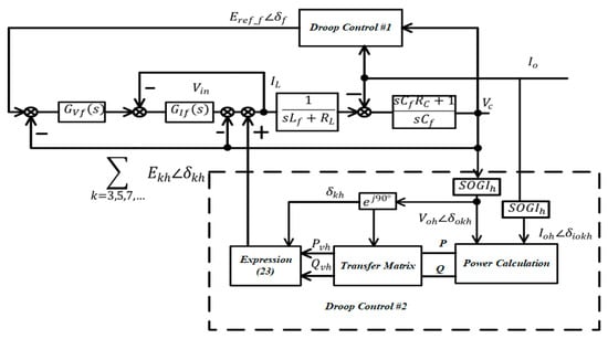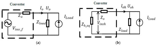 In Figure 5a, the variable with the subscript f indicates that the signals are in fundamental frequency. As mentioned above, load current and load voltage contain harmonic components, which do not exist in the inverter’s output voltage. Thus, the equivalent circuit of harmonic frequent signals is shown in Figure 5b. According to [15], when the feedback signals of are opposite to the load harmonic voltage, the equivalent harmonic output impedance will be decreased: