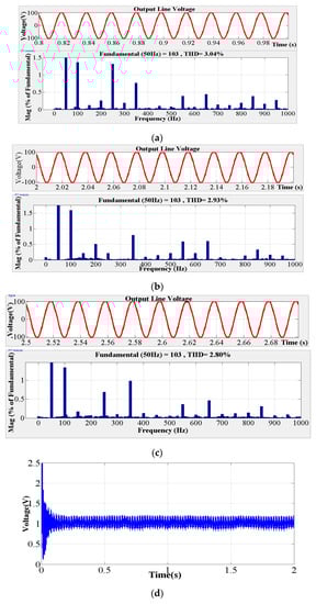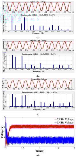 Figure 9c shows the FFT result of the output voltage with the proposed algorithm. The magnitudes of 250 Hz and 350 Hz harmonic voltage using this algorithm are displayed in Figure 9f. The mitigation algorithm starts to work at 1 s. Under this condition, THD = 11.87% and the magnitudes of 250 Hz and 350 Hz harmonic are 3 V and 1 V in the final part.