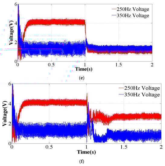 As shown in Figure 9a, the THD of the output voltage is 14.38% without any compensation algorithm. The magnitudes of 250 Hz and 350 Hz harmonic components under this condition are displayed in Figure 9d. Under this condition, the magnitudes of 250 Hz and 350 Hz harmonic are 4 V and 2 V, respectively.