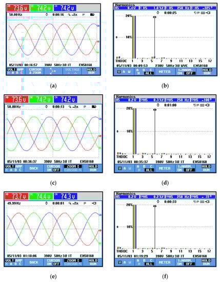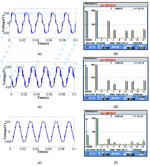 Figure 11e,f indicate the result of the output voltage when the proposed algorithm is applied. The THD reduces to 8.7% and the 5th harmonic component reduces to nearly 5%, while the 7th harmonic component reduces dramatically at the same time.