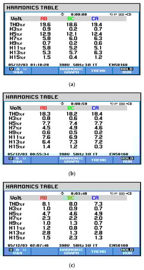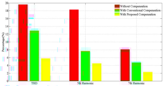 Figure 12 provides the data of the harmonic components under three conditions. Based on the above, the THD, the 5th harmonic component and the 7th harmonic component were selected to make the comparison. The result of the harmonic voltage mitigation performance is shown in Figure 13.
