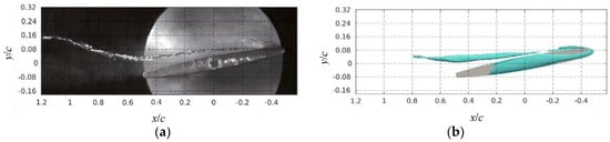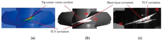 To obtain reliable flow details near the tip clearance, the accuracy of the simulation method should be validated. On the basis of the shear stress transport (SST) k-ω model, Decaix et al. [29] validated the tip-vortex trajectory using RANS (see Figure 13). Szantyr et al. [30] compared four turbulence models (i.e., standard k-ε, renormalization group (RNG) k-ε, SST k-ω, and Reynolds stress model) with the measurement. They concluded that RNG k-ε is the best for simulating the tip-vortex cavitation, and SST k-ω is optimal under the noncavitation condition [27]. RANS and LES were compared to quantify the flow parameters [31,32]. In general, each model has its own advantages, but no universal model has been suggested. Readers may refer to References [29,30,31,32] for more details. To study the TLV cavitation around the same hydrofoil, a rotation-curvature-corrected SST model is applied in the numerical calculation, and results show that this model increases the prediction accuracy for cavitation patterns at large tip clearances [33].