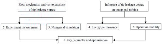 Figure 4 shows the structure of this review paper. It first focuses on the fundamental flow pattern under the influence of tip clearance. Section 2 presents the research and achievements on the flow mechanism of tip-clearance flow through experimental measurement. Section 3 provides a general review of the simulation work on the flow pattern induced by tip clearance under non-cavitation and cavitation conditions. Then, the influences of tip clearance on energy performance (Section 4) and operation stability (Section 5) are discussed. Finally, the key parameters and associated flow optimization with the tip clearance are presented in Section 6 to improve the flow pattern and performance of pumps and turbines. Therefore, the following four subjects are covered in this review paper: