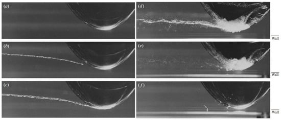 Visualizations of tip-vortex cavitation for different tip clearances: (a) 50 mm; (b) 20 mm; (c) 13 mm; (d) 4 mm; (e) 2 mm; (f) 0.5 mm [12].