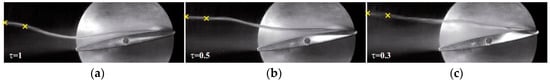 TLV Cavitation visualizations during 11 ms for three tip clearances. The two crosses are the locations z/c = 1 and 1.2 [14]. (a) τ = 1; (b) τ = 0.5; (c) τ = 0.3.