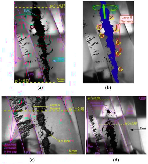 High-speed video images of the three-dimensional tip-leakage vortex [20]. (a) Tip leakage vortex; (b) Lay B filaments; (c) Lay A filaments; (d) Remnant filaments and burst. s is a coordinate aligned with the blade chord; c is the chord length; Utip: tip velocity.