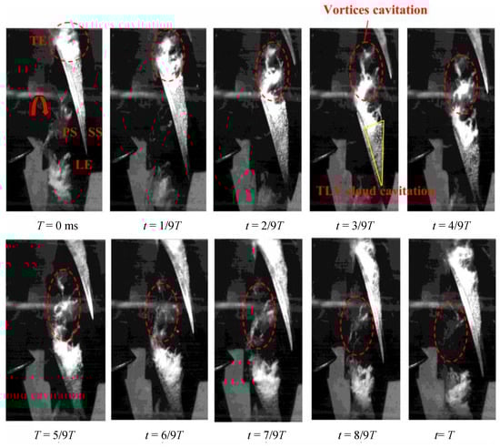 Pressure drop often occurs near the tip clearance due to the combined effect of leakage flow and the intensive rotation of the liquid around the vortex. This pressure drop can lead to serious cavitation in the operation of pump and turbine. Cavitation is known to cause intensive noise, vibration, and erosion for machinery components [23]. In an axial waterjet pump, Tan et al. [24] found that the apex angle between the perpendicular cavitation vortex (PCV) and the blade tip increases from 8° to 12° when the cavitation number varies from 0.39 to 0.45, indicating a linear relationship in this range, as shown in Figure 11. Zhang et al. [8] investigated the patterns of TLV cloud cavitation in an axial flow pump. Their observation of the tip cavitation cloud in a period of 18 ms (see Figure 12) shows that TLV cloud cavitation maintains a persistent triangular structure from the leading edge to 80% chord. A definite trajectory is not observed starting from the 80% chord (see the circle in Figure 12), and the cavitation pattern dramatically changes from then. These results demonstrate a definite triangular structure for the most part of TLV cloud cavitation, but the cavitation pattern is unstable near the trailing edge.