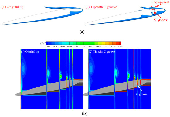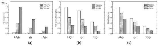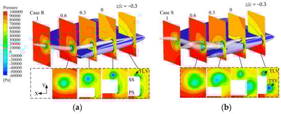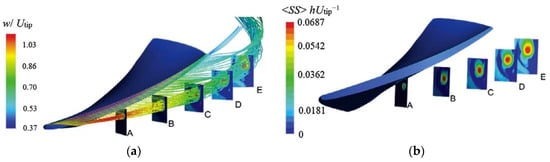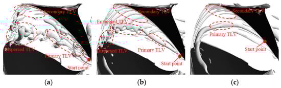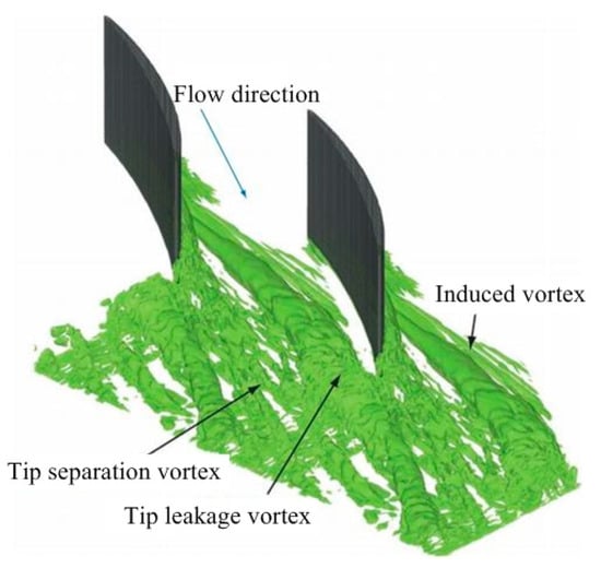 These complicated vortexes have a remarkable influence on the flow pattern. Studies on the mechanisms of viscous losses [39,40,41] show that the TLV and leakage flow can lead to violent turbulence intensity, which increases the viscous losses near the tip clearance. Using the results from numerical simulation, You et al. proposed strategies to improve the engineering design, such as optimizing the direction of leakage flow by changing the tip shape.