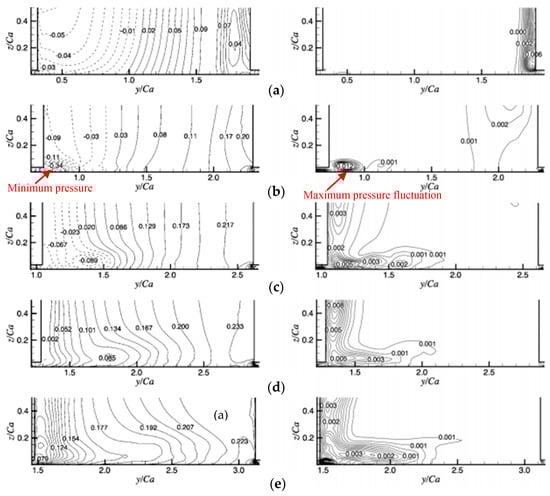 Distribution of mean pressure and pressure fluctuations: (a) 10% chord; (b) 30% chord; (c) 50% chord; (d) 70% chord; and (e) 90% chord [41].
