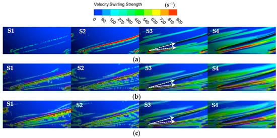When cavitation occurs, the TLV structure becomes more complex. As shown in Figure 20, the TLV develops from the blade-leading edge to the middle of the flow passage (S1 to S3), expanding in size. While approaching the adjacent blade, the TLV decays and collapses due to the tip-clearance flow and the interaction with the main flow. The sheet cavitation originating from the primary blade interacts with the TLV cavitation cloud between S3 and S4. A new cavitation cloud called PCV develops toward the adjacent blade, continuously changing its size and direction along the development. When the PCV is near the adjacent blade, it is thickened, and the direction is nearly perpendicular to the suction side of the adjacent blade.