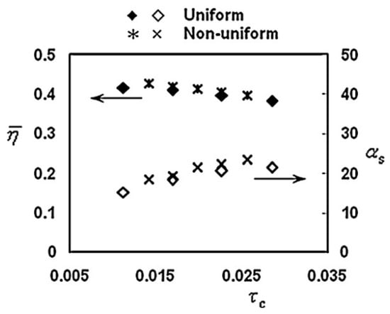 First, the influence of tip clearance on energy performance of pumps is investigated. Saha and coworkers [46,47] conducted experiments to investigate the hydraulic performance and flow characteristics in a mixed-flow pump with different tip clearance sizes. In Figure 22, H denotes the pump head, N denotes the rotating speed of the impeller, UT denotes the blade speed of the rotor outlet tip, D denotes the diameter of the impeller tip at the outlet, ηH denotes the hydraulic efficiency, tc denotes the tip-clearance size, and Ctip denotes the tip chord. Therefore, the three expressions, , , and , in Figure 22 denote the normalized pump head, flow rate, and tip-clearance size, relatively. It is indicated that the pump efficiency and the pump head are nearly linearly related to the tip-clearance size near the design flow rate. This observation is consistent with the numerical simulation result [5]. However, the descent slopes of the head are different between References [47] and [5], which may be ascribed to the operating conditions and the tip-clearance ranges.