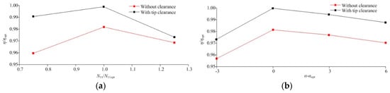 Pump head and efficiency versus tip-clearance size near design flow rate: (a) head; (b) efficiency [47].