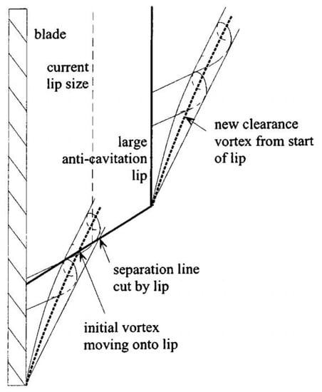 Many studies have focused on hydrofoils due to their simple geometries and excellent visualization for flow patterns and evolution mechanism. Therefore, many researchers have conducted fundamental investigations on the flow around the hydrofoil with tip clearance, and this section provides related knowledge and discoveries. The TLV cavitation and tip vortex near the hydrofoil [10,11,12,13] have been well studied for various hydrofoil parameters, fluid properties, tip-clearance ranges, and flow conditions. Using laser Doppler velocimetry (LDV) in an elliptical hydrofoil, Boulon et al. [12] found that clearance size (confinement) influences the minimum pressure at the vortex core and the associated tip-vortex cavitation. A strong tip-vortex cavitation occurs in a tested range of clearance (4–20 mm) and diminishes when the clearance is outside the range (see Figure 5). In actual application, a hydrofoil may experience sustained oscillations and thus generate unsteady TLV cavitation. Murayama et al. [13] found that the TLV-cavitation pattern varies with the oscillation of the attack angle, and a phase difference exists between the TLV-cavitation variation and such an oscillation. The size of the TLV cavitation decreases with the increase in oscillating frequency.