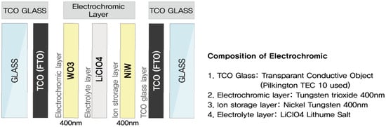 - According to the analysis of the optical characteristics by a spectrometer, it was found that the solar transmittance of the electrochromic glass sample can be adjusted in the range of 41.6–48.1% when decolored, and up to 6.5% when colored. It was also found to be adjustable in the range of 52.8–64.8% when decolored, and up to 12% when colored, for the case of visible transmittance. In examining the optical characteristics after composing triple glass for construction by using the LBNL’s Optic and Window tool, the thermal transmittance showed a high thermal insulation property of 1.19 W/m2 K. The solar transmittance was adjustable in the range of 25–35.7% when decolored, and up to 10.7% when colored. The visible transmittance was adjustable in the range of 37.8–46.3% when decolored, and up to 8.5% when colored. Thus, the potential of the electrochromic glass to serve as a solar radiation controlling device was fully demonstrated.