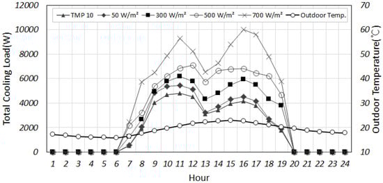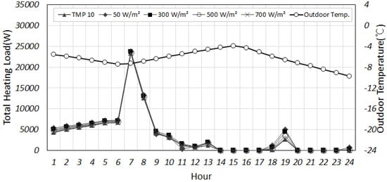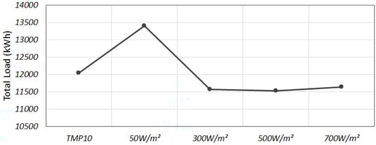 | Heating Load (kWh) | TMP 10 | 50 W/m2 | 300 W/m2 | 500 W/m2 | 700 W/m2 |