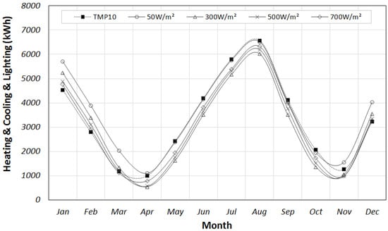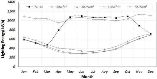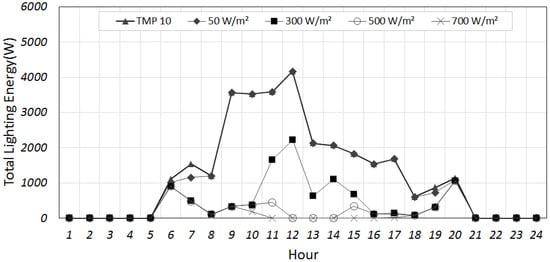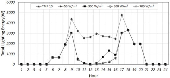 | Lighting Energy (kWh) | TMP 10 | 50 W/m2 | 300 W/m2 | 500 W/m2 | 700 W/m2 |