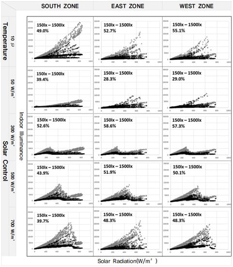 | Temperature/Solar Radiation | Glare Reduction | Heating Load Reduction | Cooling Load Reduction | Lighting Energy Reduction | |