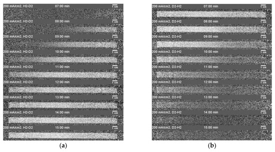 Figure 5 gives an overview of the impact of the changeover between H2 and D2 within the cell operating at 200 mA cm-2 and λan/ca = 2/2. The time shown in the first image of Figure 5a,b indicates that it took roughly 7 min for the anode gas to flow through the cell from the 3-way valve, which was dominated by the gas flow rate and the length and diameter of the gas tube. In Figure 5a, from top to bottom, it was observed that the exchange of H-to-D (images getting brighter) occurred along the gas orientation (from right to left) gradually. After 5 min, the changeover from H-to-D almost finished. In contrast, 5 min after the first visible effects due to the exchange of D-to-H (shown in Figure 5b), some parts of the active area were still brighter than the non-active area, which implies that there remained some deuterium in the MEA. Furthermore, simultaneous changes in the cell voltage (Figure 5c,d) could be observed, which also indicated the exchange time of H-to-D and D-to-H. In general, the H-to-D exchange proceeded faster (5–6 min) than the D-to-H exchange (7–8 min). Additionally, in some previous work [17], the cell performance was poor and the H/D exchange time was short (time of H-to-D exchange process was 108–138s; the time of the D-to-H exchange process was 144–174 s), which could be explained by the lower phosphoric acid content (up to 70 µm of the phosphoric acid layer) in the cell.