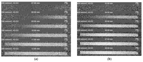 To investigate the influence of current density on the proton exchange rate, radiographs and transmittance changes of the cell operated at 200 mA cm−2, 400 mA cm−2, 600 mA cm−2, and λan/ca = 2/2 were exhibited for the H-to-D exchange (see Figure 7). This clearly reveals a faster D2 uptake for the higher current density of the cell, indicating that the current of the cell has a significant effect on the H/D exchange rate because of a higher amount of charge carrier that is transferred over the same time period at a higher current density. Additionally, we noted the exchange times at 200 mA cm−2, 400 mA cm−2, and 600 mA cm−2 to be 5–6 min, 2–3 min, and 1–2 min, respectively, which demonstrates an inversely proportional relationship.