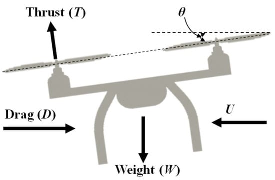 The flight maneuvers of multirotor UAVs are commonly controlled by the variation in the rotational speed of each motor. In a forward flight (pitch/roll), the vehicle is slightly inclined as shown in Figure 2. When the vehicle is straight and is in the steady-level flight mode, all forces should be balanced. Therefore, the thrust (T) can be expressed as