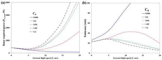 Figure 6. (a) Rotor required power; (b) estimated endurance with various drag coefficients. W is 14 kg, C0 is 16,000 mAh and V0 is 49 V.