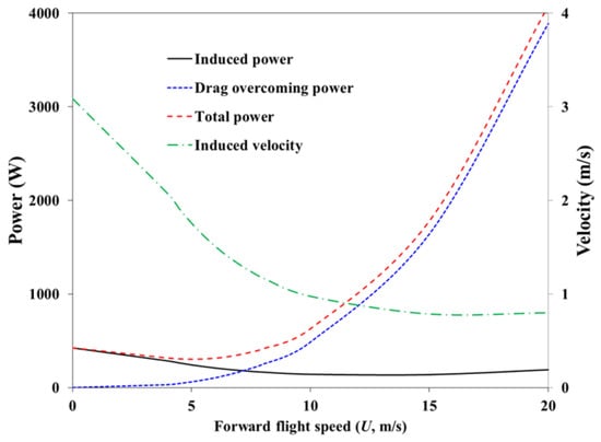 As it was previously stated, both the induced power and the power for overcoming the drag determined the magnitude of Pre,rotor. To investigate the contribution of each power to the required power and endurance, Pre,rotor is represented in terms of the induced velocity, induced power, and the power for overcoming the drag in Figure 7. As U increases, the induced velocity Ui gradually decreases. Therefore, the induced power is reduced, although the magnitude of the thrust increases with an increase in flight speed. In contrast, as noted in Equations (3) and (4), the drag force and the power for overcoming the drag are proportional to the square and the third power of U, respectively. As a result, Pre,rotor initially decreases owing to a larger reduction in the induced power compared with increases in the power for overcoming the drag and reaches the minimum value. Thereafter, Pre,rotor increases owing to a large increase in the power for overcoming the drag force. However, Pre,rotor at the minimum value of Cd has a different behavior and gradually decreases, as in Figure 6a. In comparison with the reduction in the induced power, a relatively slow increase in the drag due to a small drag coefficient in the range of the observed flying speed is the cause of this difference.